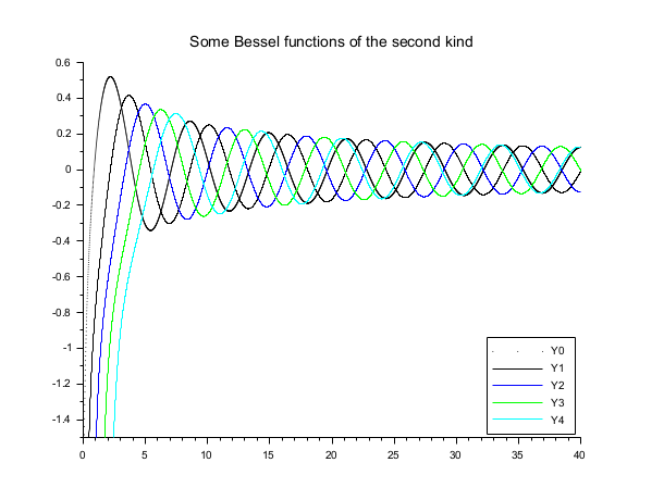 // besselY functions // ================= x = linspace(0.1,40,5000)'; // Y Bessel functions are unbounded for x -> 0+ clf() plot2d(x,bessely(0:4,x), style=0:4, rect=[0,-1.5,40,0.6]) legend('Y'+string(0:4),4); xtitle("Some Bessel functions of the second kind")