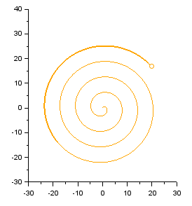 // Одна комета по спирали: t = linspace(0, 10*%pi, 500); clf, isoview comet(t.*sin(t), t.*cos(t), "colors", "orange")