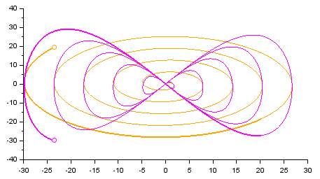 // Выбранные цвета : t = linspace(0, 10*%pi, 500)'; clf comet(t.*sin(t), [t.*cos(t) t.*sin(2*t)], "colors", ["orange" "mag"])