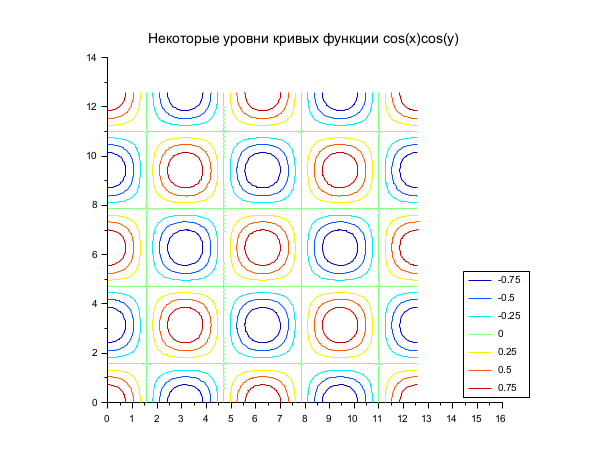 xtitle("Некоторые уровни кривых функции cos(x)cos(y)")