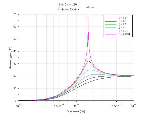 s = %s; wn = 1; clf(); Z = [0.95 0.7 0.5 0.3 0.13 0.0001]; for k=1:size(Z,'*') z = Z(k) H = syslin('c', 1 + 5*s + 10*s^2, s^2 + 2*z*wn*s + wn^2); gainplot(H, 0.01, 1) p = gce(); p = p.children; p.foreground = k; end title("$\frac{1+5 s+10 s^2}{\omega_n^2+2\omega_n\xi s+s^2}, \quad \omega_n=1$") legend('$\xi = '+string(Z)+'$') plot(wn/(2*%pi)*[1 1], [0 70], 'r') // Natural pulsation