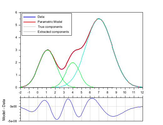 // Basic gaussian component: function Y=gauss(X, average, stDev, ymax) Y = ymax * exp(-(X-average).^2 / (2*stDev*stDev)) endfunction // Model: cumulated gaussian laws function r=model(P, X) // P(1,:): averages P(2,:): standard deviation P(3,:): ymax r = 0; for i = 1:size(P,2) r = r + gauss(X, P(1,i), P(2,i), P(3,i)); end endfunction // Gap function: function r=gap(P, XY) r = XY(2,:) - model(P, XY(1,:)) endfunction // True parameters : Pa = [ 1.1 4 7 // averages 1 0.8 1.5 // standard deviations 3 2 5.5 // ymax ]; Nc = size(Pa,2); // Number of summed curves Np = 200; // Number of data points // Data generation (without noise) xmin = 0; xmax = 10; X = linspace(xmin-2, xmax+2, Np); Y = model(Pa, X); Data = [X ; Y]; // Curve to analyze / fit // FITTING // ------- // Fitting parameters: initial values and bounds (amplitudes must be > 0) Po = [ linspace(xmin,xmax,Nc) ; ones(1,Nc)*0.5 ; ones(1,Nc)*max(Y)/2]; Pinf = [ones(1,Nc)*-2 ; ones(1,Nc)*0.1 ; ones(1,Nc)*1]; Psup = [ones(1,Nc)*12 ; ones(1,Nc)*3 ; ones(1,Nc)*max(Y)*1.2]; // Fitting [P, dmin] = datafit(gap, Data, 'b',Pinf,Psup, Po, 'qn','ar',200,200); // Display // ------- clf() xsetech([0 0 1 0.8]); plot(X, Y, "-b", X, model(P,X), "-r"); gca().children.children(1:2).thickness = 2; for i = 1:Nc plot(X, gauss(X, Pa(1,i), Pa(2,i), Pa(3,i)), "-c"); // True gaussian components plot(X, gauss(X, P(1,i), P(2,i), P(3,i)), "-g"); // Extracted gaussian components end legend("Data", "Parametric Model","True components", "Extracted components", 2); xsetech([0 0.75 1 0.25]) plot(X, model(P,X)-Y); gca().x_location = "top"; gca().x_ticks.labels = emptystr(size(gca().x_ticks.labels,"*"),1); ylabel("Model - Data") xgrid(color("grey70"))