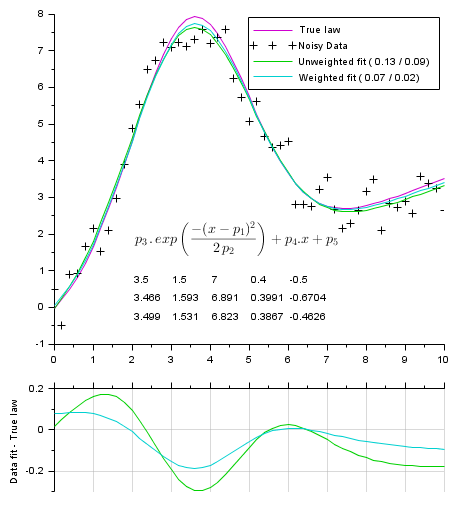 // Model (parabola) function y=FF(x, p) y = (p(1)*x + p(2)).*x + p(3) endfunction // Data creation pa = [2;-4;14] // parameters of the actual law, to generate data X = 0:0.1:3.5; Y0 = FF(X, pa); noise = 5*(rand(Y0)-.5); // We add some noise Y = Y0 + noise Data = [X ; Y]; // Gap function definition function e=G(p, Data) e = Data(2,:) - FF(Data(1,:), p); // vertical distance endfunction // Performing the fitting // ---------------------- // Without weighting data: p0 = [1;-1;10] [p, dmin] = datafit(G, Data, p0); // The uncertainty is identified to the noise value. // The weight is set inversely proportional to the uncertainty [pw, dmin] = datafit(G, Data, 1./abs(noise), p0); // Display // ------- scf(0); clf() xsetech([0 0 1 0.83]) plot2d(X, Y0, 24) // True underlaying law plot2d(X, Y, -1) // Noisy data plot2d(X, FF(X, p), 15) // best unweighted fit plot2d(X, FF(X, pw), 18) // best weighted fit legend(["True law" "Noisy data" "Unweighted fit" "Weighted fit"],2) xsetech([0 .75 1 0.25]) plot2d(X, FF(X,p)-Y0, 15) // remaining gap <= best unweighted fit plot2d(X, FF(X,pw)-Y0, 18) // remaining gap <= best weighted fit ylabel("Data fit - True law") ax = gca(); ax.x_location = "top"; tmp = ax.x_ticks.labels; gca().x_ticks.labels = emptystr(size(tmp,"*"),1); xgrid(color("grey70"))
