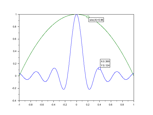 x=linspace(-1,1,1000); clf() e = plot(x,sinc(20*x),x,1-x.^2); d21=datatipCreate(e(2),600); d1=datatipCreate(e(1),700); function str=mydisplay(h) pt = h.data; str=msprintf('sinc(%-0.2g)=%-0.2g', 20*pt(1),pt(2)) endfunction datatipSetDisplay(d21,"mydisplay")