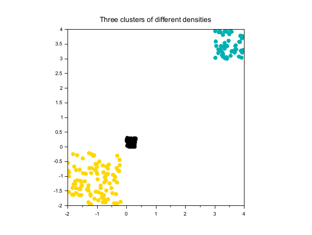 rand("seed", 0) X1 = 0.3*rand(100,2); X2 = rand(50,2) + 3; X3 = 1.8*rand(100,2) - 2; X = [X1; X2; X3]; labels = dbscan(X, 0.4, 5); scf(); scatter(X(:,1), X(:,2), [], labels, "fill"); xtitle("Three clusters of different densities"); gca().isoview = "on";