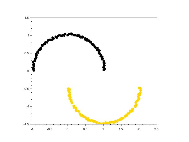 rand("seed", 0) n = 100; t = linspace(0, %pi, n)'; X1 = [cos(t), sin(t)] + 0.05*rand(n,2); X2 = [1-cos(t), -sin(t)-0.5] + 0.05*rand(n,2); X = [X1; X2]; labels = dbscan(X, 0.2, 5); scf(); gca().isoview = "on"; scatter(X(:,1), X(:,2), [], labels, "fill");
