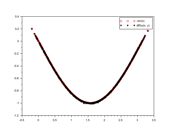 clf(); x = linspace(0, %pi, 1e3); y = cos(x); dy = diffxy(x, y); plot(x, -sin(x), "ro", x, dy, "k*"); legend(["-sin(x)", "diffxy(x, y)"]);