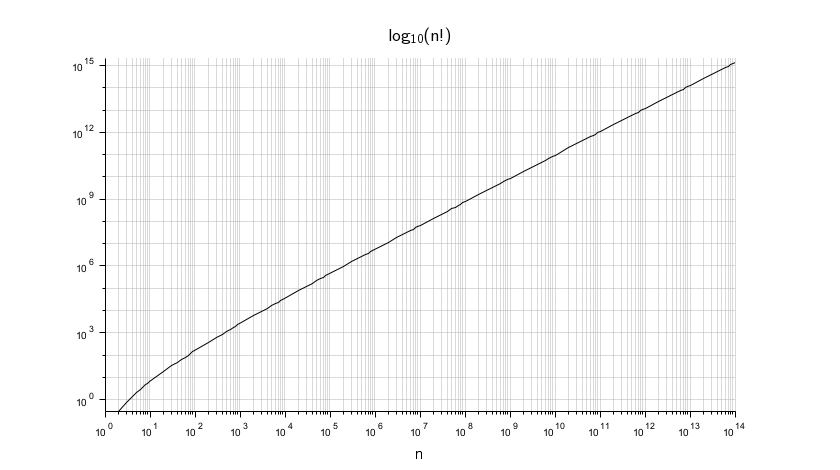 x = (10^(0:13)).*.(1:9); x(1)=[]; x($)=1e14; [f, p, m] = factorial(x); clf plot2d("ll", x, p+log10(m)) xlabel("n", "fontsize",3) title("$\mathsf{log_{10}(n!)}$", "fontsize", 4) xgrid(color("grey70"), 1, 7) set(gca(), "sub_ticks",[8 2], "tight_limits","on"); gca().data_bounds([1 4]) = [1 2e15]; gcf().axes_size = [850 480];