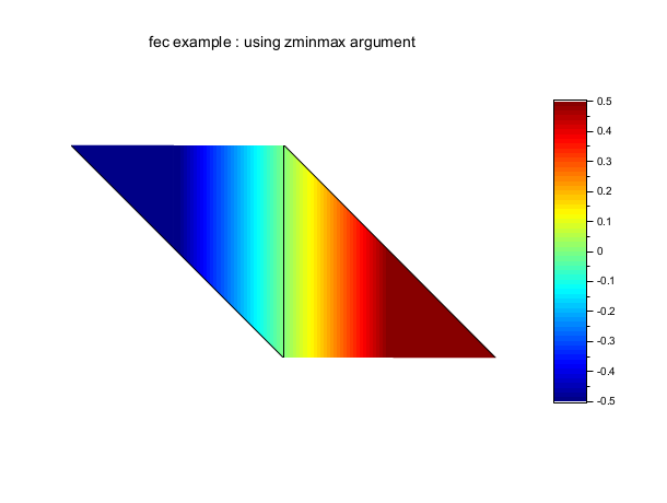 // define a mini triangulation (4 vertices, 2 triangles) x = [0 1 0 -1]; y = [0 0 1 1]; T = [1 1 2 3 1; 2 3 4 1 1]; z = [0 1 0 -1]; // values of the func at each vertices // this example shows the effect of zminmax and uses the // previous example data (you have to execute the it before) clf() gcf().color_map = jet(64); colorbar(-0.5,0.5) // be careful colorbar must be set by hands ! fec(x,y,T,z,strf="040", zminmax=[-0.5 0.5], mesh=%t) xtitle("fec example : using zminmax argument") show_window()