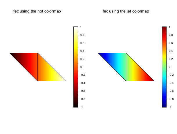 // define a mini triangulation (4 vertices, 2 triangles) x = [0 1 0 -1]; y = [0 0 1 1]; T = [1 1 2 3 1; 2 3 4 1 1]; z = [0 1 0 -1]; // values of the func at each vertices // this example shows a feature from colminmax: // playing with 2 colormaps for 2 subplots. It // uses also the data of the first example. clf() gcf().color_map = [hot(64); jet(64)]; subplot(1,2,1) colorbar(-1,1,[1 64]) fec(x,y,T,z,strf="040", colminmax=[1 64], mesh=%t) xtitle("fec using the hot colormap") subplot(1,2,2) colorbar(-1,1,[65 128]) fec(x,y,T,z,strf="040", colminmax=[65 128], mesh=%t) xtitle("fec using the jet colormap") show_window()