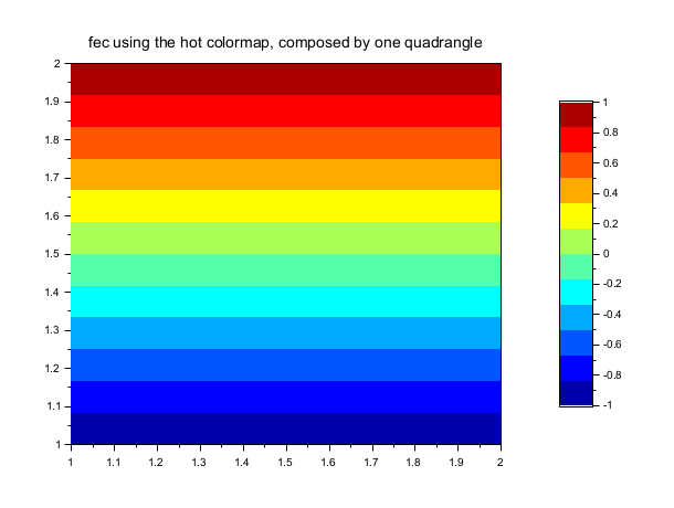 // define a mapping with one quadrangle (4 vertices, 1 quadrangle) x = [1 2 2 1]; y = [1 1 2 2]; T = [1 1 2 3 4 0]; z = [-1; -1; 1; 1]; // values of the func at each vertices clf() f = gcf(); f.color_map = jet(12); colorbar(-1,1); fec(x,y,T,z,mesh=%t) xtitle("fec using the hot colormap, composed by one quadrangle")