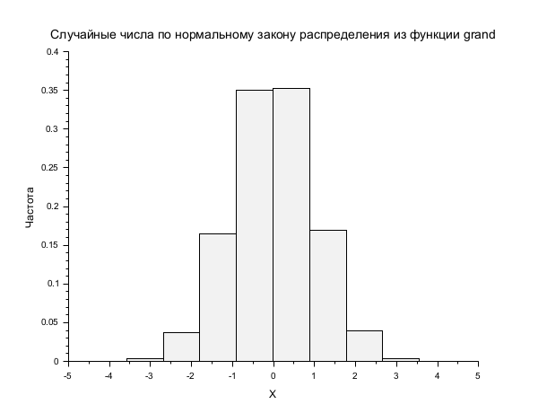 // Возвращает матрицу размером 400 x 800 случайных чисел // по нормальному распределению, с матожиданием 0 и дисперсией 1. R = grand(400,800,"nor",0,1); scf(); histplot(10,R); xtitle("Случайные числа по нормальному закону распределения из функции grand","X","Частота");