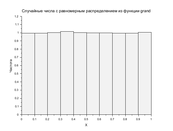 // Возвращает матрицу размером 400 x 800 случайных чисел // с равномерным распределением в [0,1). R = grand(400,800,"def"); scf(); histplot(10,R); xtitle("Случайные числа с равномерным распределением из функции grand","X","Частота");