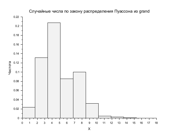 // Возвращает матрицу размером 400 x 800 случайных чисел // по распределению Пуассона и матожиданием, равным 5. R = grand(400,800,"poi",5); scf(); histplot(10,R); xtitle("Случайные числа по закону распределения Пуассона из grand","X","Частота");