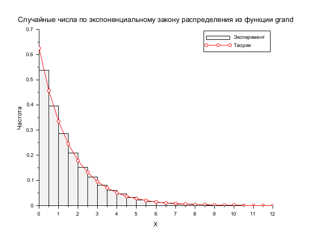 lambda=1.6; N=100000; X = grand(1,N,"exp",lambda); scf(); classes = linspace(0,12,25); histplot(classes,X); x=linspace(0,12,25); y = (1/lambda)*exp(-(1/lambda)*x); plot(x,y,"ro-"); legend(["Эксперимент" "Теория"]); xtitle("Случайные числа по экспоненциальному закону распределения из функции grand","X","Частота");