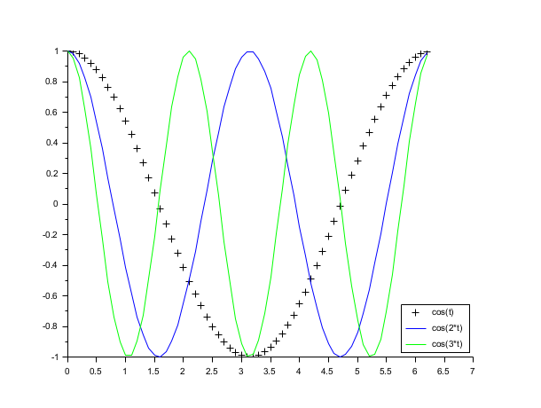 // Example 1 t=0:0.1:2*%pi; plot2d(t,[cos(t'),cos(2*t'),cos(3*t')],[-1,2 3]); legends(['cos(t)';'cos(2*t)';'cos(3*t)'],[-1,2 3],opt="lr")