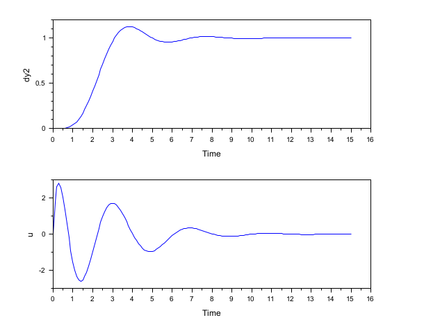M = 1; m = 0.2; k = 0.1; b = 0.004; A = [0 1 0 0 -k/M -b/M k/M b/M 0 0 0 1 k/m b/m -k/m -b/m]; B = [0; 1/M; 0; 0]; C = [1 0 0 0 //dy1 0 0 1 0];//dy2 //inputs u and e; outputs dy1 and dy2 P = syslin("c",A, B, C); // Discretize it dt=0.1; Pd=dscr(P, dt); // The noise variances Q_e=1; //additive input noise variance R_vv=0.0001; //measurement noise variance Q_ww=Pd.B*Q_e*Pd.B'; //input noise adds to regular input u Qwv=blockdiag(Q_ww,R_vv); //The compensator weights Q_xx=diag([0.1 0 1 0]); //Weights on states R_uu = 0.1; //Weight on input Qxu=blockdiag(Q_xx,R_uu); //Control of the second mass position (y2) Qi=50; J=lqg(Pd(2,:),Qxu,Qwv,Qi); H=lft([1;1]*Pd(2,:)*(-J),1); //step response t=0:dt:15; r=ones(t); dy2=flts(r,H); clf; subplot(211);plot(t',dy2');xlabel("Time");ylabel("dy2") u=flts([r;dy2],J); subplot(212);plot(t',u');xlabel("Time");ylabel("u")