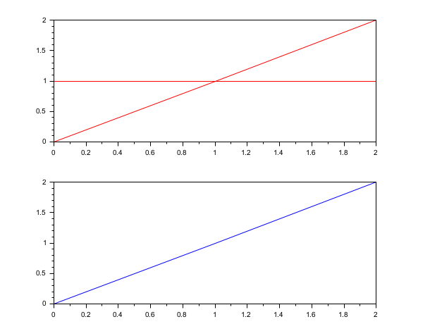 // Now both problems represent one straight line (reglin(x, x)) from (0,0) to (2,2), // but while the second argument of the first problem (reglin(x, y)) represents // a flat line (with equation y = 1), the second argument of the second problem // (reglin(x, y2)) ignores the central point of y (set to %nan) so the flat line // now has equation y = 0, because the two remaining points are (0,0) and (2,0). subplot(211) x = 0:2; y = [0 3 0]; [a1, b1] = reglin(x, [x ; y]); plot(x', (a1*x+repmat(b1,1,3))', "red") subplot(212) y2 = y; y2(2) = %nan; // y2 = [0 %nan 0]; [a2, b2] = nanreglin(x, [x ; y2]); plot(x', (a2*x+repmat(b2,1,3))', "blue")