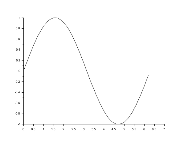 // x initialisation x=[0:0.1:2*%pi]'; //simple plot plot2d(sin(x));