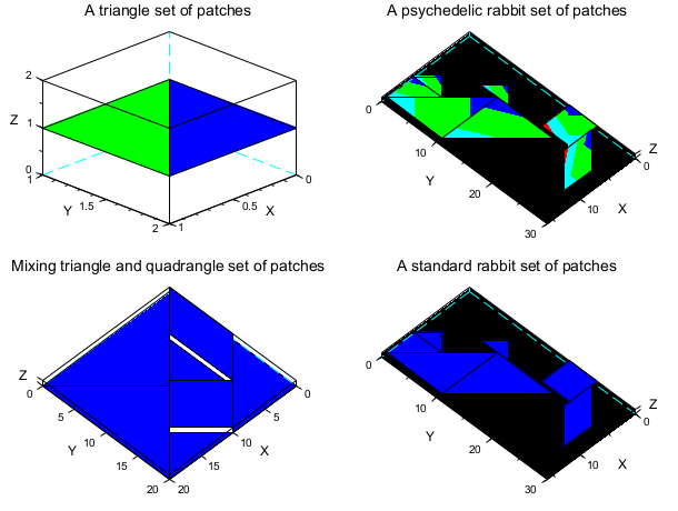 // The plot3d function to draw patches: // patch(x,y,[z]) // patch(x,y,[list(z,c)]) // The size of x : number of points in the patches x number of patches // y and z have the same sizes as x // c: // - a vector of size number of patches: the color of the patches // - a matrix of size number of points in the patches x number of // patches: the color of each points of each patches // Example 1: a set of triangular patches x = [0 0; 0 1; 1 1]; y = [1 1; 2 2; 2 1]; z = [1 1; 1 1; 1 1]; tcolor = [2 3]'; subplot(2,2,1); plot3d(x,y,list(z,tcolor)); xtitle('A triangle set of patches'); // Example 2: a mixture of triangular and quadrangular patches xquad = [5, 0; 10,0; 15,5; 10,5]; yquad = [15,0; 20,10; 15,15; 10,5]; zquad = ones(4,2); xtri = [ 0,10,10, 5, 0; 10,20,20, 5, 0; 20,20,15,10,10]; ytri = [ 0,10,20, 5,10; 10,20,20,15,20; 0, 0,15,10,20]; ztri = zeros(3,5); subplot(2,2,3); plot3d(xquad,yquad,zquad); plot3d(xtri,ytri,ztri); xtitle('Mixing triangle and quadrangle set of patches'); // Example 3: some rabbits rabxtri = [ 5, 5, 2.5, 7.5, 10; 5, 15, 5, 10, 10; 15, 15, 5, 10, 15]; rabytri = [10, 10, 9.5, 2.5, 0; 20, 10, 12, 5, 5; 10 0 7 0 0]; rabztri = [0,0,0,0,0; 0,0,0,0,0; 0,0,0,0,0]; rabtricolor_byface = [2 2 2 2 2]; rabtricolor = [2,2,2,2,2; 3,3,3,3,3; 4,4,4,4,4]; rabxquad = [0, 1; 0, 6; 5,11; 5, 6]; rabyquad = [18,23; 23,28; 23,28; 18,23]; rabzquad = [1,1; 1,1; 1,1; 1,1]; rabquadcolor_byface = [2 2]; rabquadcolor = [2,2; 3,3; 4,4; 5,5]; subplot(2,2,2); plot3d(rabxtri, rabytri, list(rabztri,rabtricolor)); plot3d(rabxquad,rabyquad,list(rabzquad,rabquadcolor)); h = gcf(); h.children(1).background = 1; xtitle('A psychedelic rabbit set of patches'); subplot(2,2,4); plot3d(rabxtri, rabytri, list(rabztri,rabtricolor_byface)); plot3d(rabxquad,rabyquad,list(rabzquad,rabquadcolor_byface)); h = gcf(); h.children(1).background = 1; xtitle('A standard rabbit set of patches');