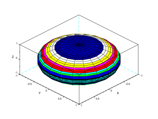 [X, Y, Z] = sphere([20, 40]); e=plot3d2(X,Y,Z); e.color_mode=4; // change color f_data=e.data; TL = tlist(["3d" "x" "y" "z" "color"],f_data.x,f_data.y,f_data.z,10*(f_data.z)+1); e.data=TL; e.color_flag=2;