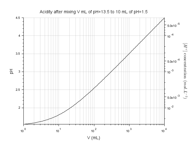 pH1 = 1.5; // v1 = 10 mL of acid solution pH2 = 12.5; // v2 mL of basic solution v2 = logspace(0,4,200); // naive raw pH estimation after mixing pH = -log10((10*(10.^-pH1) + v2*(10.^-pH2))./(10+v2)); clf plot2d("ln",v2, pH) ax1 = gca(); ax1.tight_limits(2) = "on"; ax1.sub_ticks(1) = 8; xgrid(color("grey70")*[1 1],[1 1],[7 7]) title("Acidity after mixing V mL of pH=13.5 to 10 mL of pH=1.5", "fontsize",3) xlabel("V (mL)", "fontsize",3) ylabel("pH", "fontsize",3); // [H^+] logarithmic 2nd scale ax2 = newaxes(); ax2.data_bounds([4 3]) = 10.^(-ax1.data_bounds([3 4])); set(ax2, "filled","off", "y_location","right", "log_flags","nln") ax2.tight_limits(2) = "on"; ax2.axes_visible(2) = "on"; ax2.axes_reverse(2) = "on"; ylabel("$[H^+]\text{ concentration }(mol.L^{-1})$","fontsize",3) ax2.y_label.font_angle = 90;