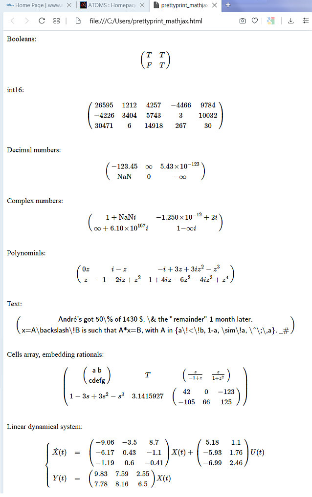 // Please run the first example section to define objects to be converted, // before executing this section. // // Header: mathjaxURL = "https://cdnjs.cloudflare.com/ajax/libs/mathjax/2.7.5/MathJax.js?config=TeX-MML-AM_CHTML" html = ["<!doctype html>" "<html>" "<meta http-equiv=""Content-Type"" content=""text/html;charset=UTF-8"">" "<script src=''" + mathjaxURL + "'' async></script>" "<!-- then any LaTeX expression delimited with \[ .. \] will be rendered -->" "<body>" ]; // List of objects: for obj = L if type(obj)<>10 | part(obj,$)<>":" obj = prettyprint(obj, "latex", "(", %f, %f); html = [html ; "\[ "+ obj + "\]" ; "<br/>"]; else html = [html ; obj + " <br/>"]; end end html = [html ; "\[ "+ prettyprint(linsys, "latex", "") + "\]<br/><br/>"]; // Footer: html = [html ; "</body>" ; "</html>"]; File = TMPDIR + filesep() + "prettyprint_mathjax.html" mputl(html, File); edit(File) // See the HTML code winopen(File) // Display the page in your browser