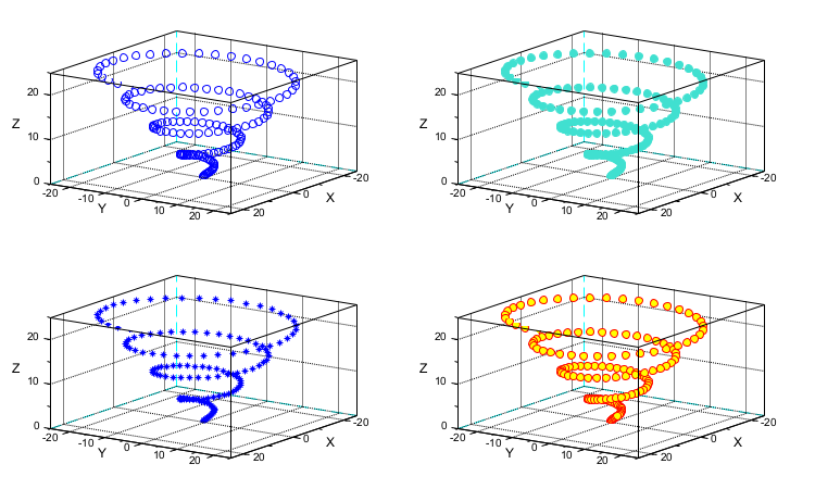 // Data z = linspace(0, 25, 150); x = z .* cos(z); y = z .* sin(z); subplot(2,2,1) scatter3d(x, y, z) // Fill the markers subplot(2,2,2) scatter3d(x, y, z, , "turquoise", "fill") // Choose another marker shape subplot(2,2,3) scatter3d(x, y, z, "*"); // Customize the markers colors subplot(2,2,4) scatter3d(x, y, z,... "markerEdgeColor", [1 0 0],... "markerFaceColor", "yellow"); // Tune the 3D orientation of all axes gcf().children.rotation_angles = [65 35];