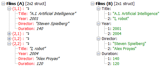 // Данные для отображения: clear films films(1) = struct("Title", "A.I. Artificial Intelligence",.. "Year", 2001, .. "Director", "Steven Spielberg", .. "Duration", 140); films(2,2) = struct("Title", "I, robot", .. "Year", 2004, .. "Director", "Alex Proyas", .. "Duration", 120); // Стилевое оформление как адресов, так и содержимого: mainTitle = "<html><b>Films (A)</b>"; tree_show(films, mainTitle , "<font color=""red"">$</font><i>"); // Стилевое оформление только содержимого: mainTitle = "<html><b>Films (B)</b>"; tree_show(films([1 4]), mainTitle, "$<font color=""green"">", %t);