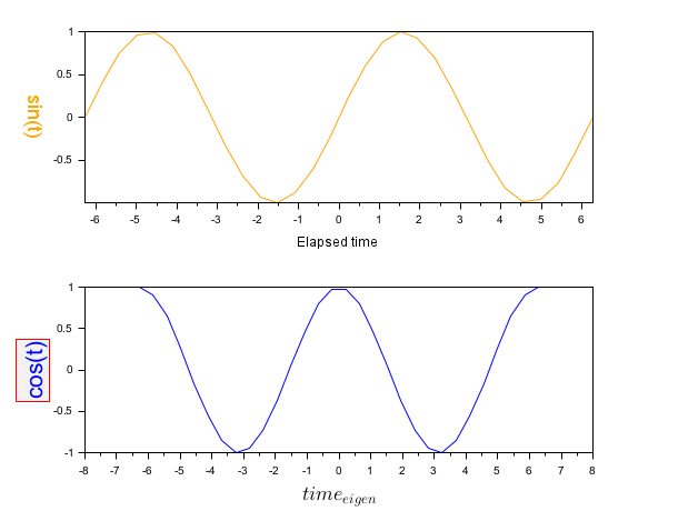 t = linspace(-2*%pi, 2*%pi, 30); plot2d([], [], 0, "011", " ", [0 0 1 1]) subplot(2,1,1) plot(t, sin(t), "color", "orange") xlabel "Elapsed time" fontsize 2 ylabel sin(t) ax1 = gca(); subplot(2,1,2) plot(t, cos(t), "b") xlabel $time_{eigen}$ fontsize 4 ylabel cos(t) fontsize 4.5 color blue ylabel edgecolor r background grey95 ylabel(ax1, "fontsize", 4) // Now ax1 is the current axes: ylabel color orange rotation -90