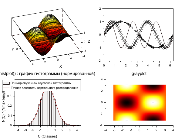 // Four plots on a single graphics window clf() set(gca(),"font_style",2,"font_size",0); xsetech([0,0,0.5,0.5]); plot3d() xsetech([0.5,0,0.5,0.5]); plot2d() xsetech([0.5,0.5,0.5,0.5]); grayplot() xsetech([0,0.5,0.5,0.5]); histplot() // back to default values for the sub-window xsetech([0,0,1,1])